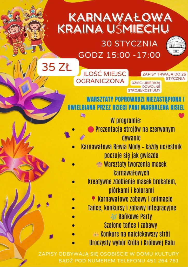Druga propozycja, to “Karnawałowa Kraina Uśmiechu” – wydarzenie, które gwarantuje świetną zabawę pełną tańca, muzyki i śmiechu. Organizatorzy zapewniają, że atmosfera podczas warsztatów karnawałowych, które również poprowadzi Pani Magdalena, będzie magiczna i niezapomniana.