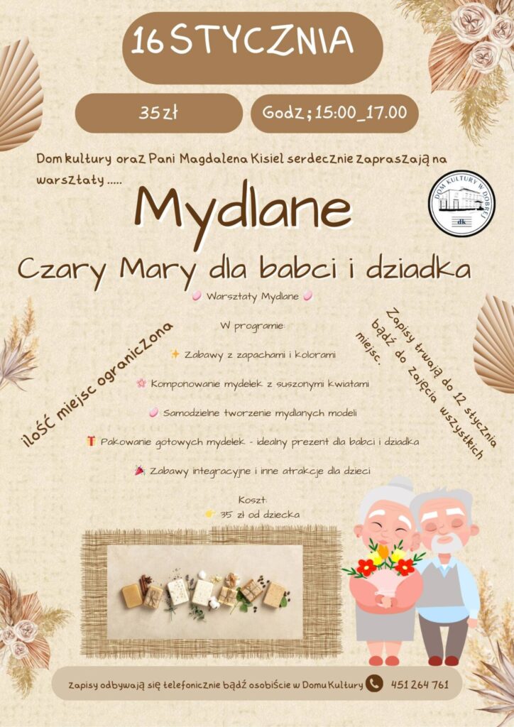 Pierwszym z nich są warsztaty mydlarskie “Czary Mary” – edycja dedykowana Babciom i Dziadkom. W ramach tych kreatywnych zajęć uczestnicy nauczą się tworzyć własnoręcznie mydła, które mogą posłużyć jako wyjątkowe i osobiste prezenty. Prowadzenie tego zajęcia powierzono niezastąpionej Pani Magdalenie, która ma na koncie już wiele udanych warsztatów.