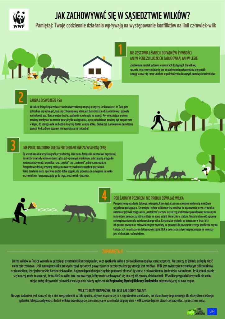 - Nie karmić wilków ani nie pozostawiać jedzenia w miejscach, gdzie mogą je znaleźć.