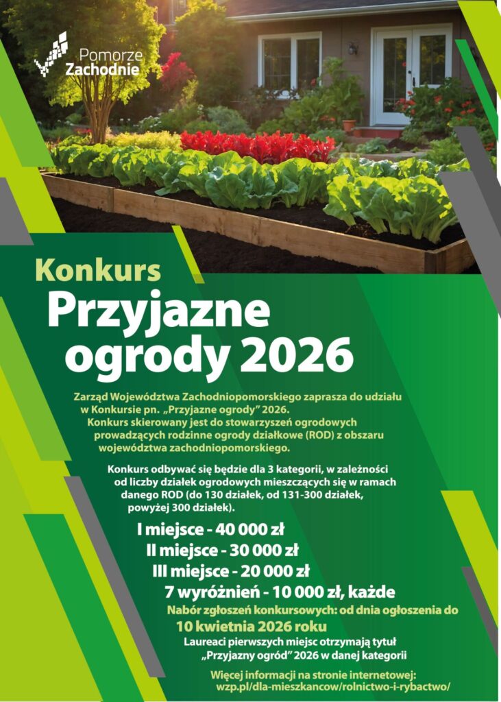Samorząd Województwa Zachodniopomorskiego ogłosił konkurs o nazwie „Przyjazne ogrody”, który ma za zadanie mobilizację lokalnych społeczności do zmiany oblicza działek, które mają służyć nie tylko wypoczynkowi, aleją też zdrowiu i integracji. Konkurs zachęca do promowania działalności gospodarczej, ekologicznej oraz społecznej.