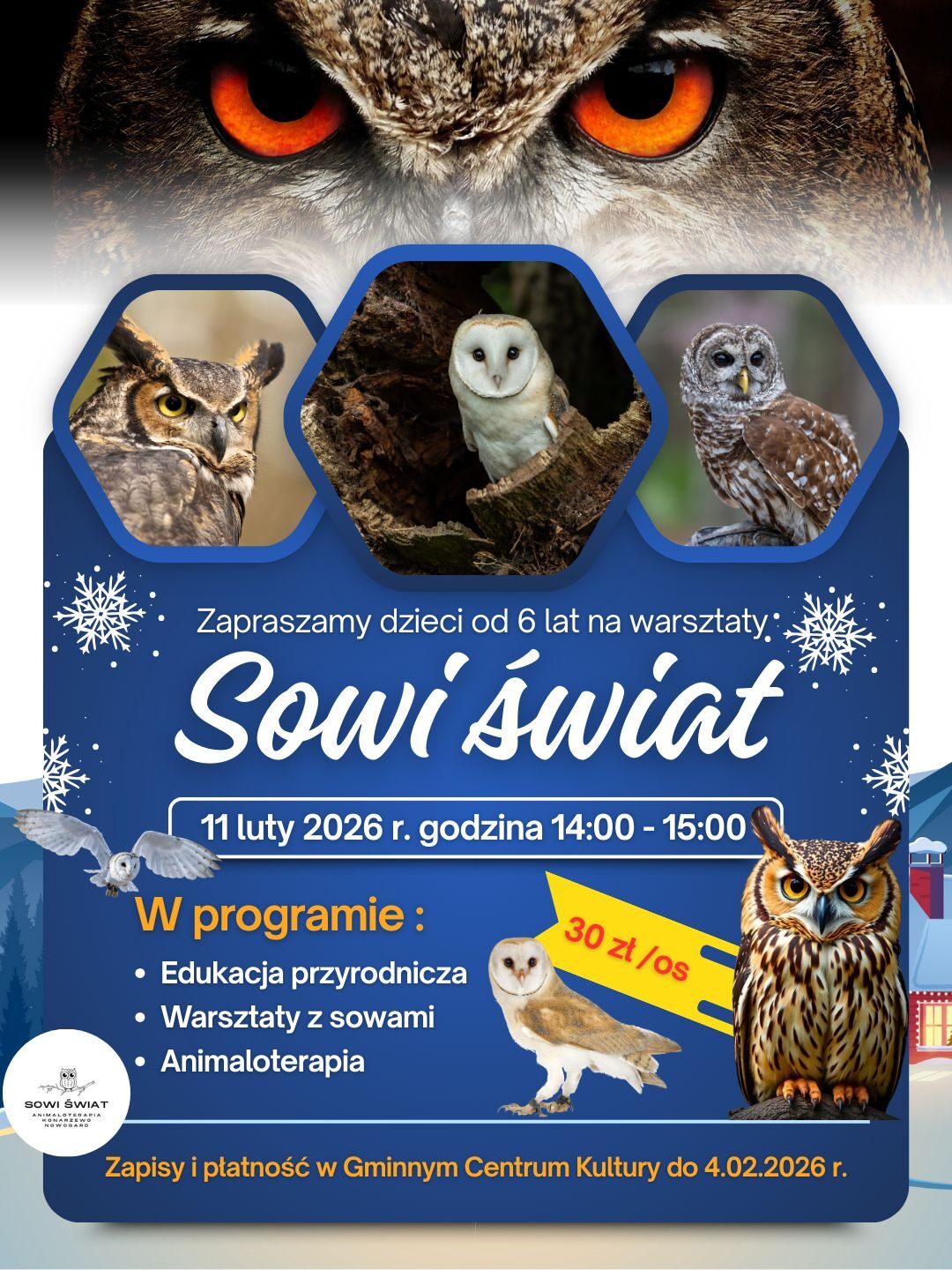 Aby wziąć udział w warsztatach należy dokonać zapisów i opłaty do 4 lutego w Gminnym Centrum Kultury. Liczba miejsc jest ograniczona, dlatego warto pośpieszyć się z rejestracją, by nie przegapić szansy na pełną magii i sowich sekretów przygodę.