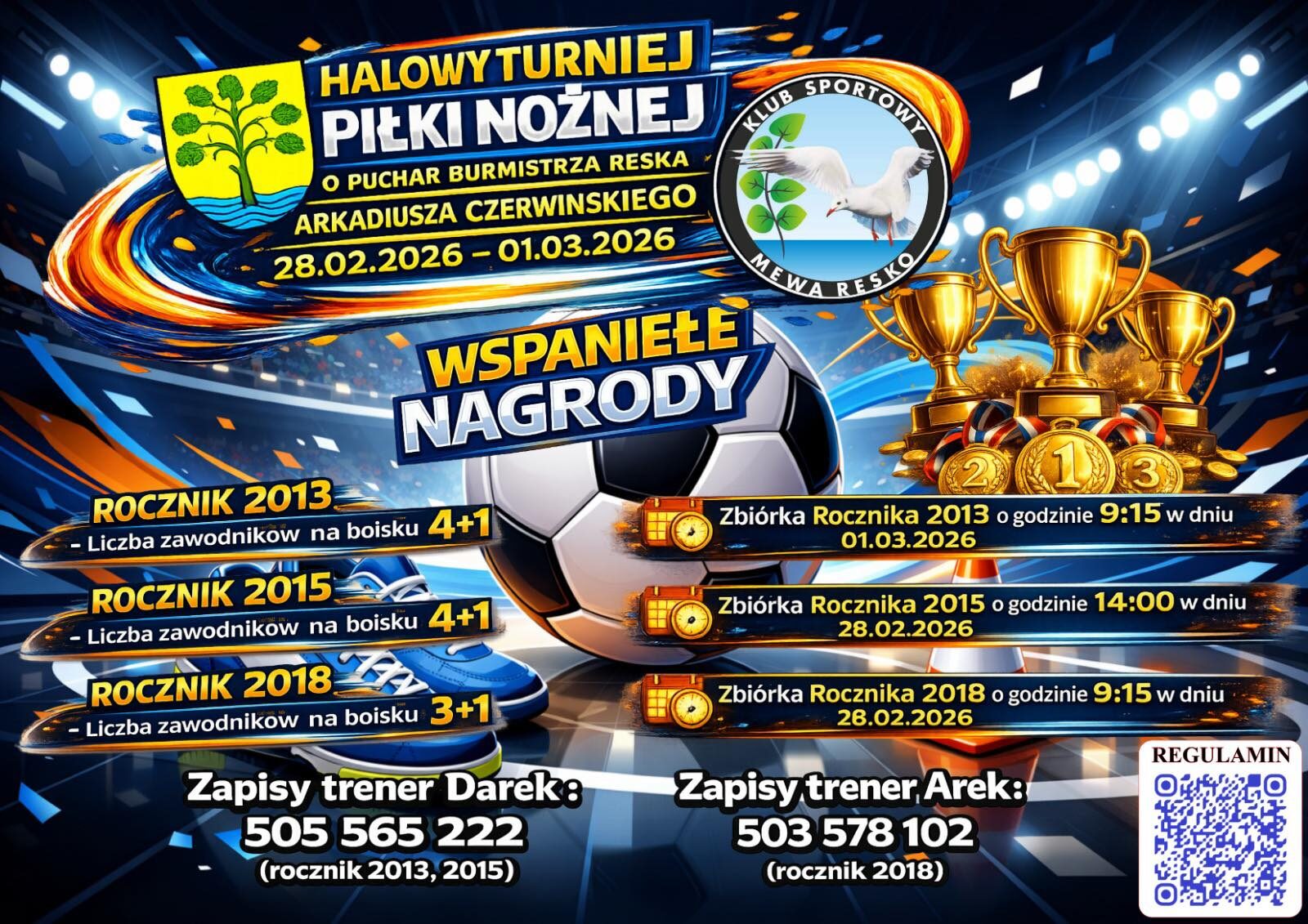 Akademia Piłkarska Mewa Resko zaprasza drużyny piłkarskie na organizowany halowy turniej piłki nożnej. Wydarzenie to odbędzie się pod koniec lutego 2026 roku i rozciągnie się na kilka dni pełnych sportowych emocji. Jest to niepowtarzalna okazja dla młodzieży, aby rozwijać swoje umiejętności piłkarskie, rywalizując o Puchar Burmistrza Reska, Arkadiusza Czerwińskiego.